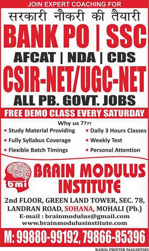 I really appreciate brain modulus institute efforts becoz bmi provide better education quality in mohali for all type govt exam ..well educated and experienced faculty ..there are many coaching institute but brain modulus institute is good becoz highly educated faculy here faculy also qualify govt exam so they share our experience and focus on every students personally best shortcuts and innovative study material provided by bmi .. bmi works for students future.....
